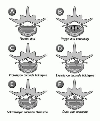 Bel fıtığı genellikle 4. bel omuruyla 5. bel omuru arasındaki, 5. bel umuruyla 1. sakrum omuru arasındaki disklerde gelişir. Bel fıtığının ilk belirtisi bel ağrısıdır. Hasta ya ani bir hareket sonrasında ya da omurgaya binen ağır bir yük sonrasında bel ağrısından yakınmaya başlar. Fıtıklaşmış olan disk, o bölgedeki omurilik sinirlerine baskı yaptığında ağrı bacaklara doğru yayılır. Bel umurlarının 4., 5. ve 1. sakrum omuru hizasından kaynaklanan omurilik sinirleri, bu düzeylerde baskıya uğradıklarında, beldeki ağrı kalçaya ve uyluğun arka-dış bölgesine doğru yayılır. Bu yayılış siyatik sinirin yayılışına uyar., Bu nedenle bu ağrıya siyatik ağrısı da denir. 4. bel omurunun üstündeki bel omurları hizasında baskıya uğrayan omurilik sinirleri, bacağın ön yüzüne doğru yayılan bir ağrıya neden olurlar. Hasta ıkındığında, hapşırdığında ya da Öksürdüğünde belde bir ağrı ortaya çıkabilir. Hastanın belinde omurga sağa ya da sola doğru anormal bir kıvrım yapmış olabilir. Bu kıvrılmaya Skolyoz denir. Sırtüstü yatmakta olan bir hastanın bacağı yukarı kaldırıldığında hastada ağrı ortaya çıkar. Bu hastalarda bel ve bacaklarda duyu kusurları da gelişebilmektedir. Hastalığın teşhisinde, hastanın yakınmaları, klinik belirtileri ve röntgen incelemelerinden yararlanılır.